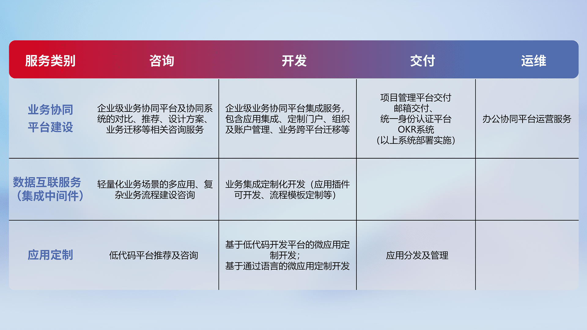 针对钉钉、、、企微、、、IDaas等平台级产品提供产品的规划、、、、方案、、、、交付、、、、定制化开发等服务,,,实现如统一协同办公、、、智能客户服务、、、、混合会议管理、、、智能数据查询、、等业务场景,,,,实现数字化转型。。。。